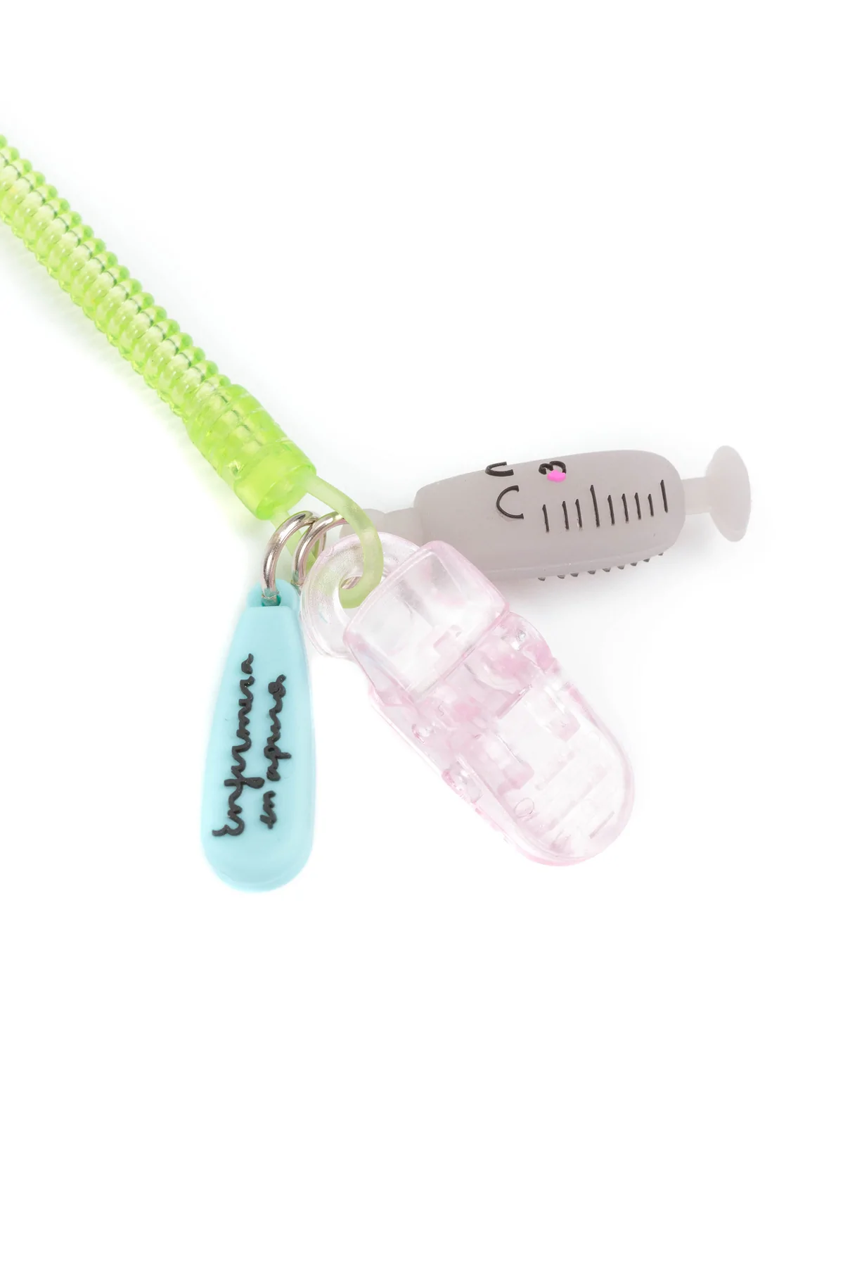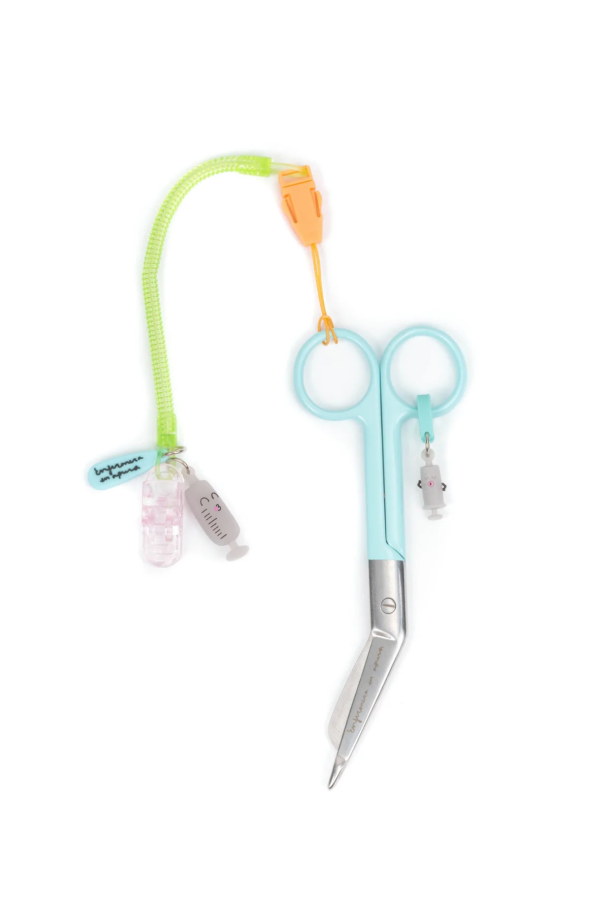 Con un muelle de plástico y dos enganches rojo sangre por los lados para trabar en el uniforme junto a tus tijeras apuradas. Y además… ¡Un charm decorativo único de corazón anatómico! 🫀 OMG!